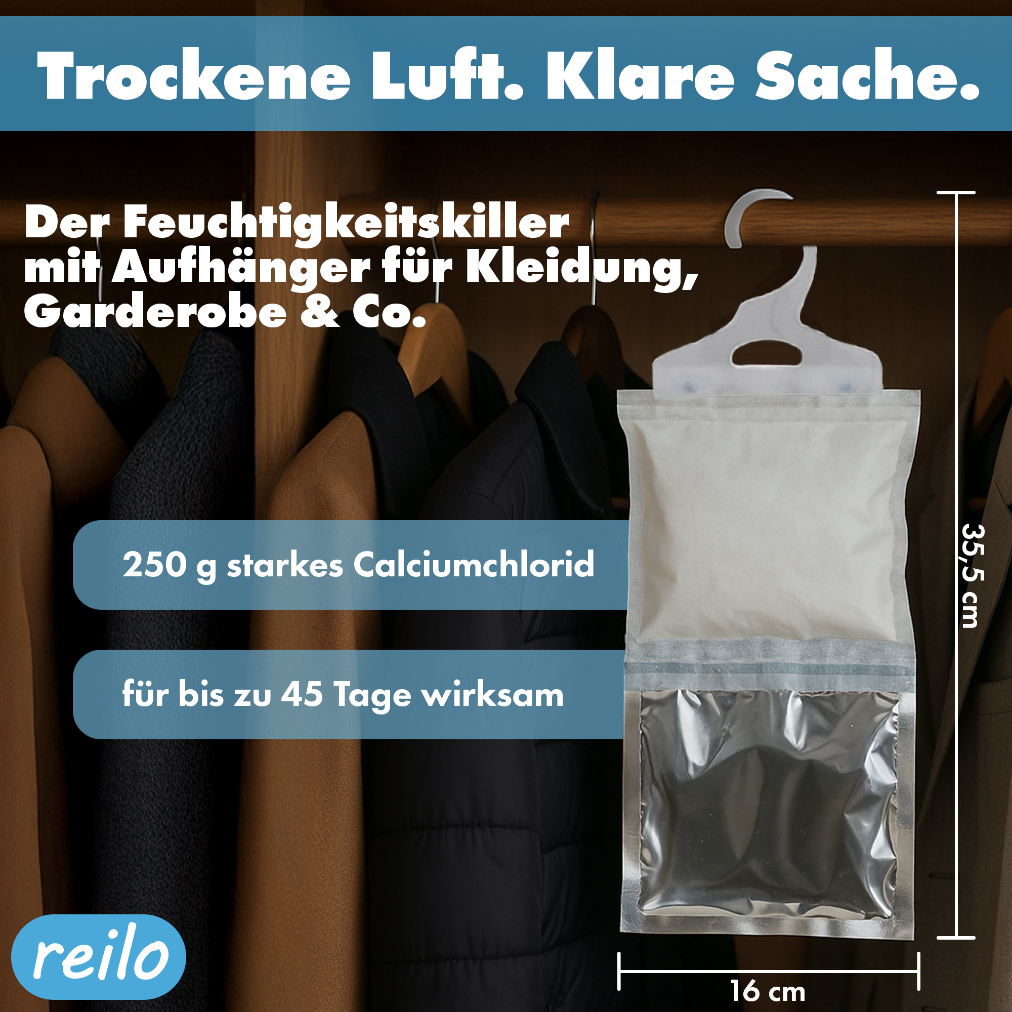 Dank des praktischen Aufhängers lässt sich der Luftentfeuchter flexibel anbringen und platzsparend einsetzen. Er eignet sich perfekt für Kleiderschränke und Garderoben oder andere kleine, abgeschlossene Räume. Sicher & sauber – kein Auslaufen