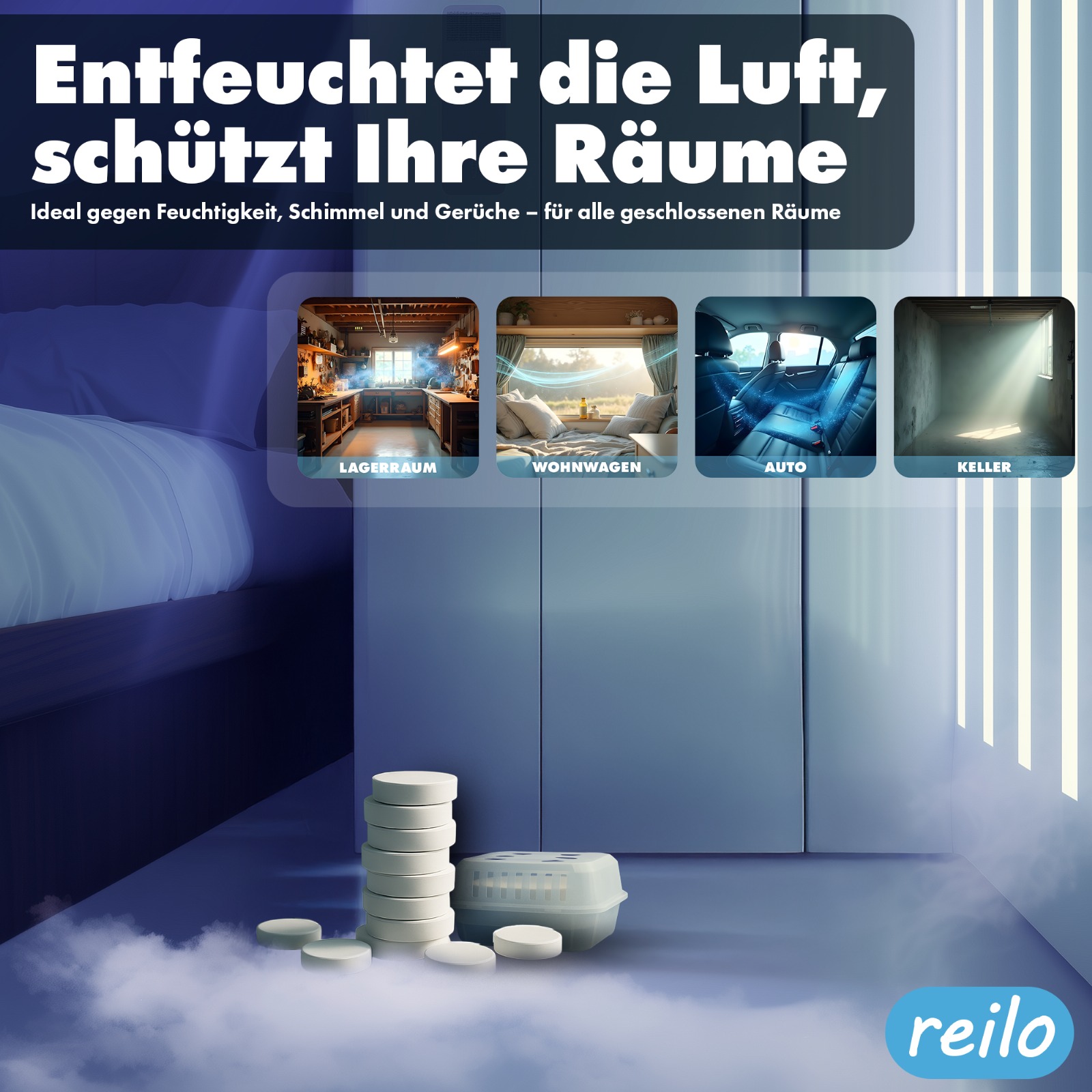Das reilo Luftentfeuchter-Komplettset bietet eine zuverlässige Lösung zur Regulierung von Luftfeuchtigkeit. Es reduziert Kondenswasser, beugt Schimmel vor und neutralisiert muffige Gerüche. Die Kombination aus Mini-Raumentfeuchterbox und 450g Tabs eignet sich für Keller, Auto, Wohnmobil, Boot, Bad oder Lagerräume.